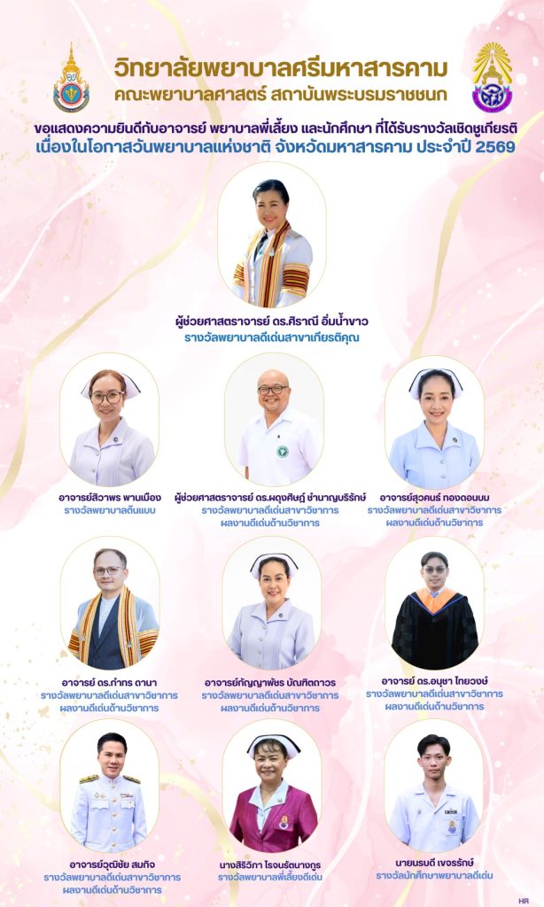 ขอแสดงความยินดีกับอาจารย์ พยาบาลพี่เลี้ยงและนักศึกษา ที่ได้รับรางวัลเชิดชูเกียรติเนื่องในวันพยาบาลแห่งชาติ จังหวัดมหาสารคาม ประจำปี 2569